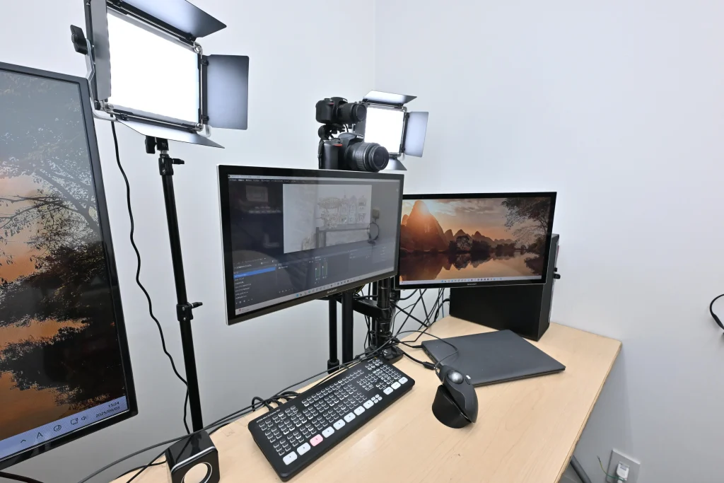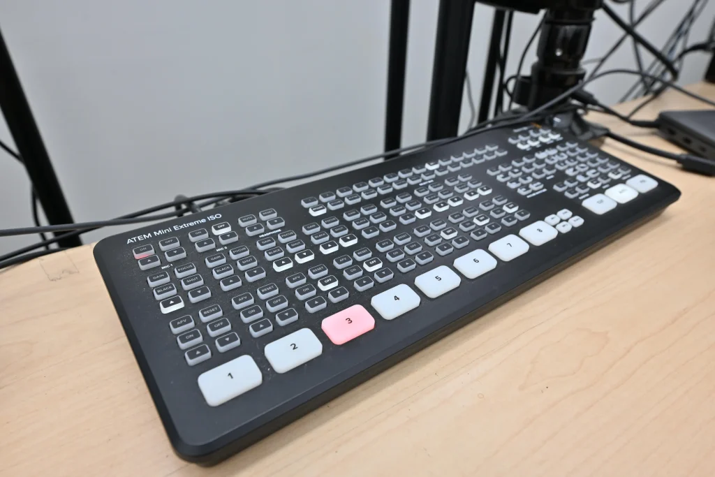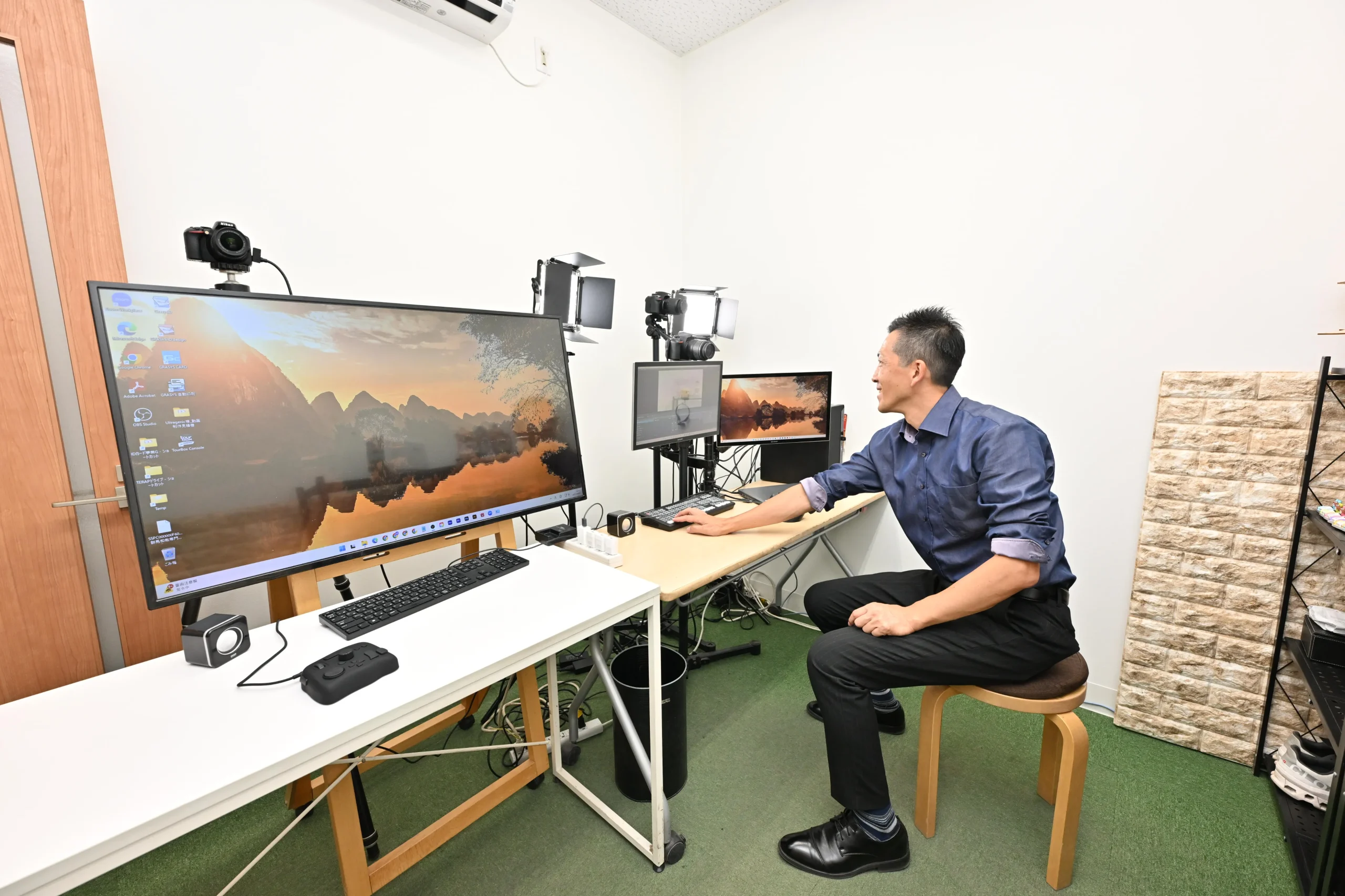 「自分の部屋を持っているのは、社内では私と社長くらいじゃないでしょうか」と冗談めかして笑う雨宮さん。その扉の向こうには、カメラ3台、照明、スイッチャーを備えた本格的な配信スタジオが広がっていました。