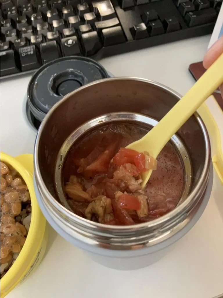 コールセンターのクルーさんがスープジャーで野菜スープ&おにぎりのお弁当を持ってきていたので、それを真似しています。ボルシチは身体を温めてくれるので冷え性の方におすすめです。