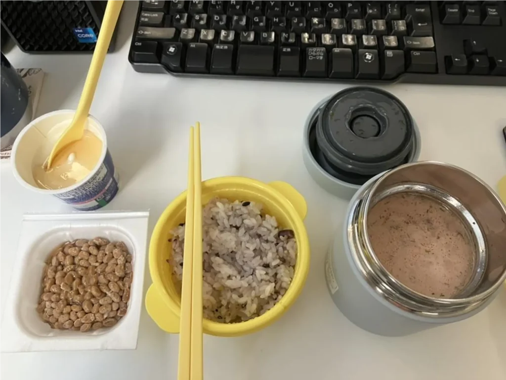 前日にお弁当を作る時間がないときは、白米だけ持ってきて、冷蔵庫に入れている液体みそとロッカーに入れている乾燥わかめとふりかけでお昼を食べています。