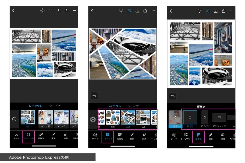 アプリの中では、写真の並びや、デザインを変えたり、まとめた写真の画面比率を変えたり。