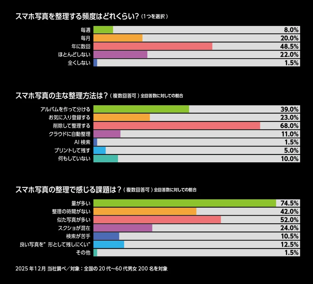 前回の記事に引き続き、今回もアンケート結果をもとに、皆さんの切実なお悩みである「写真整理」を解決するヒントを探っていきます