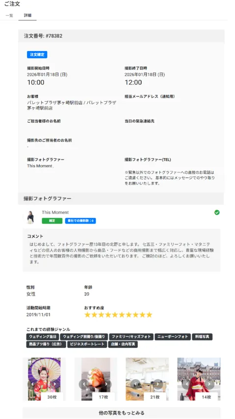 注文が確定したこの時点から、カメラマンさんと直接連絡ができます(パレットプラザは間に入りません)