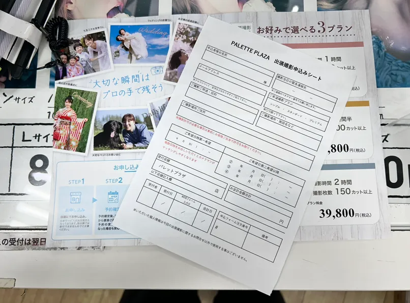 お店の受付で「出張撮影サービスをお願いしたいです」とスタッフさんに声をかけるだけ。