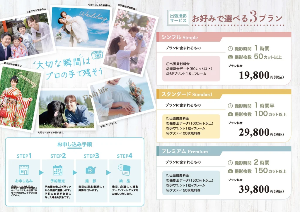 プロフォトグラファー出張撮影サービスには、3つのプランがあります。