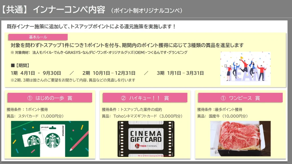 このプロジェクトにて、クロスセル事例の共有や、成果をあげたメンバーへの表彰、景品付与など、メンバーのモチベーションアップにつながる施策を実施中です。