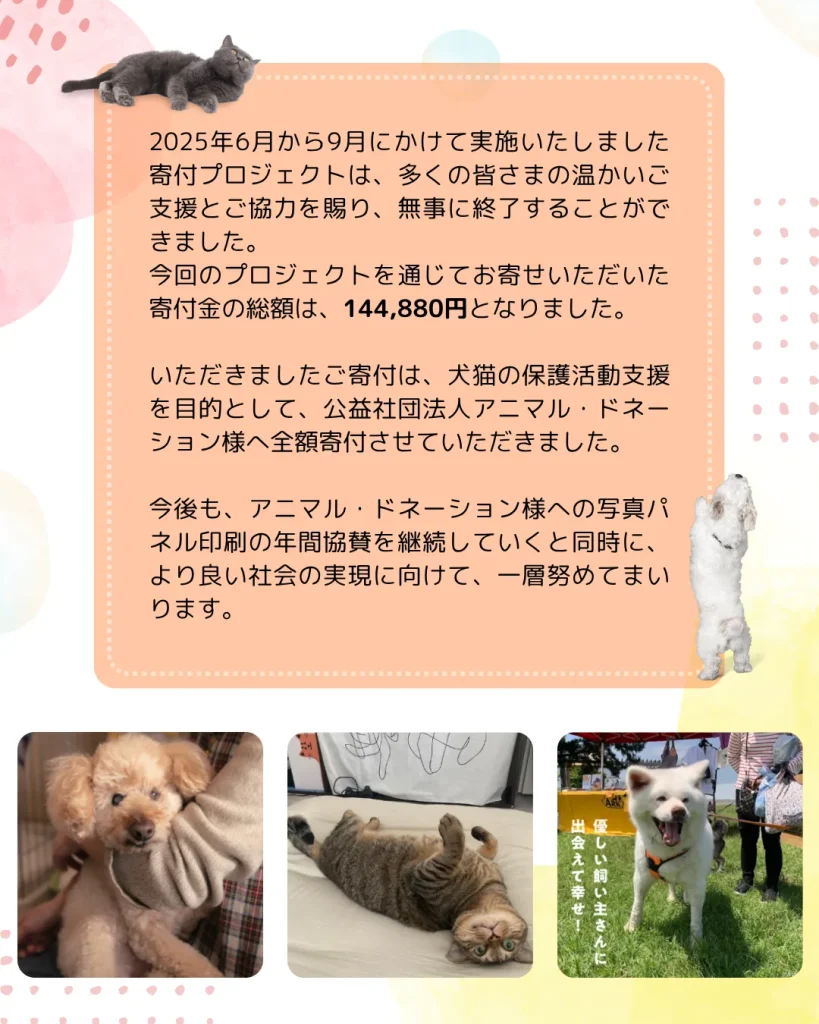私たちは写真印刷を祖業とする企業として、このパネル印刷を通じてアニマル・ドネーションの活動を支援させていただきました。